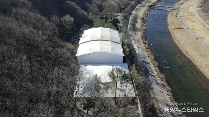이어 오전 11시 10분 머내과학공원 내 체육시설(앞쪽 게이트볼장, 뒤쪽 배드민턴장) 지붕 준공식을 연다.