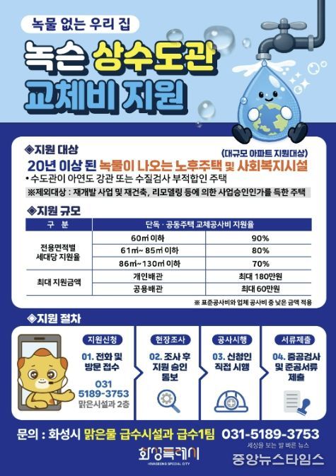 (중앙뉴스타임스 = 방재영 기자) 화성특례시는 쾌적한 주거환경 조성과 안전한 식수 환경 개선을 위해 ‘2026년 녹물 없는 우리집 수도관 개량 지원사업’을 추진한다.