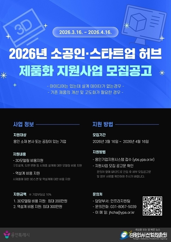 (중앙뉴스타임스 = 방재영 기자) 용인시산업진흥원(이하 진흥원)은 용인시 관내 소공인 및 스타트업의 제품 개발을 촉진하고 초기 제품의 시장 경쟁력을 강화하기 위해 '2026년 소공인·스타트업 허브 제품화 지원사업’ 참여기업을 모집한다고 2일 밝혔다.