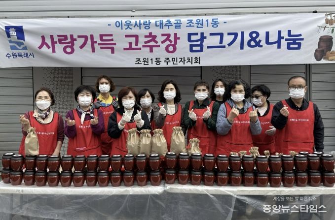 (중앙뉴스타임스 = 방재영 기자) 수원시 장안구 조원1동 주민자치회는 지난 1일, 복지행정분과 주관으로 ‘사랑가득 고추장 담그기’ 행사를 열고, 직접 담근 고추장을 관내 취약가구 200여 세대에 전달했다.