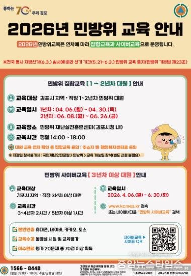 (중앙뉴스타임스 = 방재영 기자) 김포시는 2026년 상반기 민방위 대원의 안보 의식 고취와 재난 대응 역량 강화를 위해 ‘2026년 상반기 민방위 교육’을 본격적으로 시행한다고 밝혔다. 이번 교육은 민방위 대원의 연차에 따라 집합교육과 사이버교육으로 구분되어 진행되며, 특히 올해는 연차별 일정을 세분화해 운영한다.