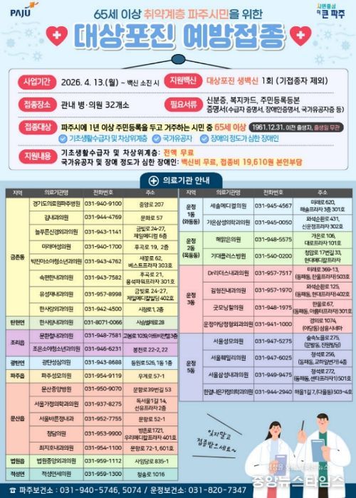 이한상 파주보건소장은 “대상포진은 어르신들에게 큰 고통을 주는 질환인 만큼 예방이 무엇보다 중요하다”라며 “이번 예방접종 지원사업을 통해 취약계층 어르신들의 건강권을 강화하고 의료비 부담을 덜 수 있도록 적극 지원하겠다”라고 말했다.