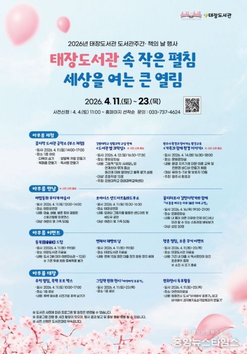 (중앙뉴스타임스 = 방재영 기자) 원주시 태장도서관은 도서관 주간 및 책의 날을 맞이해 오는 11일부터 23일까지 ‘태장도서관 속 작은 펼침, 세상을 여는 큰 열림’을 주제로 다양한 행사를 개최한다.