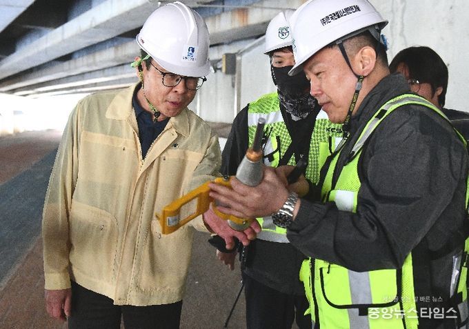 이번 정밀안전진단은 지난 3월 16일부터 오는 6월 3일까지 진행되며, 육안조사와 비파괴시험 등을 통해 교량의 구조적 안전성을 종합적으로 점검하고 있다. 특히 균열, 백태 등 외관 상태를 면밀히 조사하고, 고소작업차를 활용한 근접 외관 조사와 상부구조물 탄성시험 등을 통해 눈에 보이지 않는 미세 손상까지 확인하고 있다.