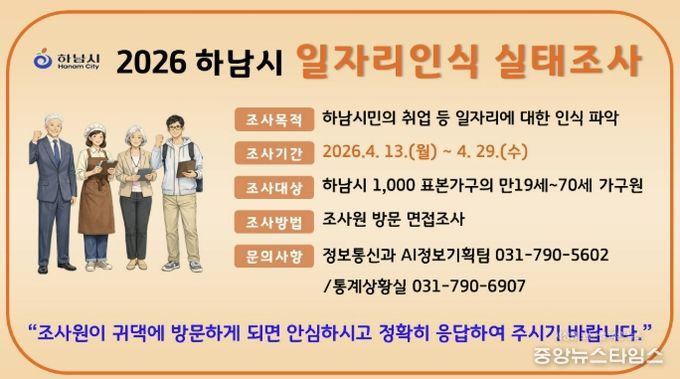 (중앙뉴스타임스 = 방재영 기자) 하남시는 오는 4월 13일부터 29일까지 17일간 ‘2026 하남시 일자리 인식 실태조사’를 실시한다고 밝혔다.
