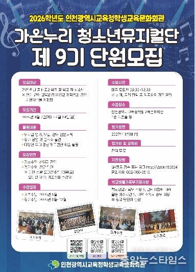 (중앙뉴스타임스 = 방재영 기자) 인천시교육청학생교육문화회관은 7일부터 24일까지 인천 지역 청소년을 대상으로 ‘2026년 청소년뮤지컬단 제9기’ 신규 단원을 모집한다고 밝혔다.