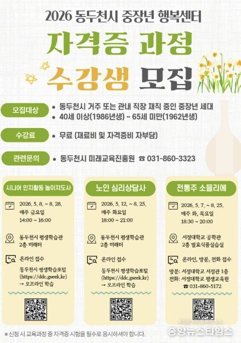 (중앙뉴스타임스 = 방재영 기자) 동두천시 미래교육진흥원은 지역 내 중장년층의 성공적인 인생 2막과 안정적인 사회 참여를 지원하기 위해 ‘2026년 중장년 행복센터 자격증 과정’ 수강생을 모집한다고 10일 밝혔다.