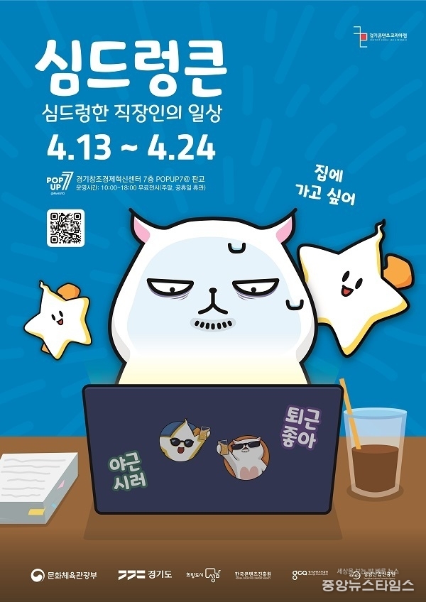 (중앙뉴스타임스 = 방재영 기자) 경기콘텐츠진흥원(이하 경콘진)은 직장인의 현실을 유쾌하게 담아낸 인스타툰 캐릭터 ‘심드렁큰’ 전시를 13일부터 24일까지 판교 경기콘텐츠코리아랩 7층 전시관 ‘POPUP7@판교’에서 개최한다고 밝혔다.