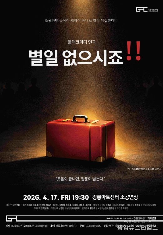 (중앙뉴스타임스 = 방재영 기자) 강릉아트센터는 오는 17일 오후 7시 30분, 소공연장에서 블랙코미디 연극 '별 일 없으시죠!!'를 선보인다.