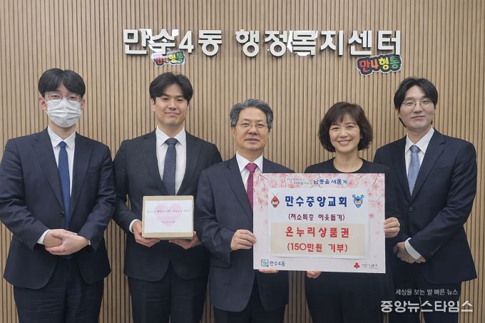 (중앙뉴스타임스 = 방재영 기자) 인천 남동구 만수4동 행정복지센터는 최근 대한예수교장로회 만수중앙교회로부터 온누리상품권 150만 원 상당을 기탁받았다고 14일 밝혔다.