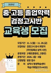(중앙뉴스타임스 = 방재영 기자) 삼척시가 학력 미취득 시민들의 학습 기회를 확대하기 위해 2026년도 중·고등 졸업학력 검정고시반을 운영한다고 3일 밝혔다. 시는 내년 1월부터 8월까지 평생학습센터에서 중졸반과 고졸반 2개 과정을 개설해, 학력취득을 희망하는 시민들에게 검정고시 대비 교육을 지원한다. 수업은 매주 화·수·목요일 오후 6시 30분부터 9시 30분까지 진행되며, 연 2회(4월·8월 예정) 실시되는 검정고시에 맞춰 체계적인 학습이 이뤄질 예정이다. 검정고시반 운영은 여러 사정으로 정규 교육과정을 이수하지 못한 시민들에게 다시 배움의 기회를 제공하고, 자기계발과 사회참여의 폭을 넓히는 데 의미가 있다. 교육생 모집은 11월 3일부터 11월 28일까지이며, 응시 희망자는 평생학습센터(삼척시 청석로3길 16-41)를 방문해 신청하면 된다. 시 관계자는 “검정고시반 운영을 통해 배움의 문턱을 낮추고 시민 누구나 원하는 학력을 취득할 수 있도록 지속적으로 지원하겠다.”며 “관심 있는 시민들의 많은 참여를 바란다.”고 전했다.
