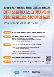 (중앙뉴스타임스 = 방재영 기자) 경기도와 경기도경제과학진흥원은 ‘2025년 경기 스타트업 글로벌 성장지원 샌프란시스코 투자유치 지원 프로그램’에 참여할 기업을 오는 21일까지 모집한다. 이 사업은 미국 진출을 희망하는 우수 기술력을 갖춘 경기도 스타트업을 대상으로 투자유치 역량 강화 컨설팅을 제공하고, 현지 투자자를 대상으로 한 투자유치 활동을 지원하기 위해 마련됐다. 현지 투자자 및 기업인과의 교류를 통해 글로벌 시장 진출 가능성을 높이는 것이 목적이다. 대상은 경기도에 본사를 둔 창업 7년 이내 스타트업이며, 신산업 분야 기업은 최대 10년 이내까지 가능하다. AI, 빅데이터, ICT 등 딥테크 분야의 유망 기업 20개 사를 서류 및 발표평가를 통해 선정할 예정이다. 선정기업에는 ▲글로벌 진출 역량 진단 ▲투자유치 설명회(IR) 역량 강화 컨설팅 ▲샌프란시스코 투자유치 설명회(IR) 및 1:1 투자상담 ▲미국한인창업자연합(UKF) 주최 글로벌 스타트업 행사(2026 UKF 82 스타트업 서밋) 참가 ▲후속 투자 연계까지 전 과정을 지원한다. 특히 한국 씨엔티테크(주), 미국 플러그앤플레이와 협