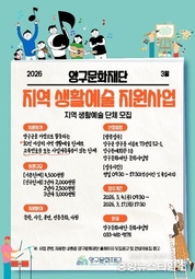 (중앙뉴스타임스 = 방재영 기자) 양구문화재단은 군민 중심의 생활문화 영역을 확대하고 지역 생활예술단체의 지속적인 창작 활동 기반을 마련하기 위해 ‘2026 지역 생활예술 지원사업’ 참여 단체를 모집한다고 8일 밝혔다. 이번 사업은 지역에서 활동하는 생활예술단체의 창작 활동을 지원하고 다양한 문화예술 활동을 통해 군민의 문화 향유 기회를 확대하기 위해 추진된다. 지원 분야는 '문화예술진흥법' 제2조 제1항에 명시된 문화예술 분야로, 문학(시·소설·수필 등), 시각예술(미술·사진·공예·서예·영상 등), 공연예술(무용·연극·음악·뮤지컬 등), 전통문화 등 생활예술 전반을 대상으로 한다. 지원 규모는 해당 사업 참여 연차와 사업 계획 등을 고려해 200만 원에서 최대 450만 원까지 차등 지원된다. 처음 선정된 단체는 1년차 신규단체로 200만 원이 지원되며, 동일 단체명이 유지된 상태로 연속 참여할 경우 최대 3년차까지 단계적으로 지원된다. 이후 4년차부터는 기존단체로 인정되어 최대 450만 원까지 지원받을 수 있다. 양구문화재단은 지난해인 2025년에도 지역 생활예술단체 12팀을 선정해 창작 활동과 전시·공연 등 다양한 생활예술 활동을 지원한 바 있다. 신청