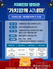 (중앙뉴스타임스 = 방재영 기자) 인천 동구는 치매환자와 가족, 지역주민이 문화를 향유 할 수 있는 치매친화 영화관 ‘가치함께 시네마’를 3월~5월까지 매월 마지막 주 수요일 운영한다고 6일 밝혔다. 영화 상영 장소는 미림극장이며 3월 25일, 4월29일, 5월 27일 상영된다. ‘가치함께 시네마’는 치매환자와 가족이 편안한 환경에서 영화를 관람할 수 있도록 마련된 치매친화 문화 프로그램으로 치매에 대한 이해를 높이고 지역사회 돌봄 문화를 확산하기 위해 기획됐다. 올해는‘봄 시즌’ 운영으로 시기를 조정하여 지역 주민의 참여 접근성을 높였으며 세대 공감형 작품과 치매 인식 개선 메시지를 담은 영화를 중심으로 상영할 예정이다. 또한 상영일에는 치매안심센터 전문 인력이 참여해 ▲치매 조기검진 상담 안내 ▲치매예방수칙 ▲치매환자 등록 안내를 위한 홍보 부스를 함께 운영하여 치매 인식개선과 정보를 제공하는‘복합문화 공간’으로 운영할 계획이다. 관람을 원하는 개인 및 단체는 동구 치매안심센터 홈페이지 공지 사항을 참고해 온라인 접수 및 동구 치매안심센터로 문의하면 된다. 김찬진 동구청장은“가치함께 시네마가 치매 환자와 가족의 사회적 고립을 완화하고 지역사회가 이해하고