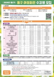(중앙뉴스타임스 = 방재영 기자) 인천 동구는 오는 9~4월 3일까지 ‘2026년 제2기 동구 여성회관’ 수강생을 모집한다고 6일 밝혔다. 오는 4월 1일부터 3개월 과정으로 진행되는 제2기 정규강좌 프로그램은 ▲실내인테리어(도배 및 필름) ▲등라탄공예 ▲요리·공예 프로그램 등 총 26개 과정으로 운영되며, 직장인을 위한 바리스타 2급 야간반 및 퇴근 후 ‘뚝딱 반찬’ 등 야간 강좌도 운영될 예정이다. 또한 브런치 만들기 강좌를 1개월 단기 특강으로 운영해 주민들이 부담 없이 참여할 수 있도록 구성했으며, 일일 무료 특강으로는 ▲핸드드립&퓨전떡 만들기 ▲딸기도지마롤케이크 만들기 ▲패션도식화(옷그리기) 특강이 준비된다. 수강 신청은 인천시 거주자를 대상(동구 주민 우선)으로 여성회관 홈페이지를 통해 선착순 접수하며 온라인 접수에 어려움을 겪는 자, 동구사랑상품권, 평생교육 바우처 사용자는 여성회관으로 방문하여 신청할 수 있다. 김찬진 동구청장은“여성회관 교육 프로그램이 주민들의 자기계발과 역량강화에 실질적인 도움이 되기를 희망한다”며 “여성뿐 아니라 남성 수강생도 많은 문의와 참여를 바란다”고 말했다.