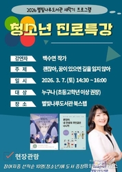(중앙뉴스타임스 = 방재영 기자) 2026년 새학기 독서문화진흥 프로그램 ‘백수연 작가의 진로 특강’이 7일 별빛나루 도서관 계단형 열람석(북스텝)에서 현장 강연으로 진행된다. 강연에 참여한 청소년 가운데 선착순 10명에게는 백 작가의 저서 ‘괜찮아, 꿈이 있으면 길을 잃지 않아’를 증정한다. 백수연 작가는 청소년지도사이자 작가, 강연가로 활동하며 청소년이 ‘진학’보다 ‘진로’를 고민하고, ‘성공’보다 ‘성장’을 지향하며, ‘미래’뿐 아니라 ‘현재’의 행복을 스스로 선택할 수 있도록 돕는 메시지를 꾸준히 전해 왔다. 이번 강연에서는 학업과 진로, 인간관계, 자기 주도 역량, 사회참여 등 청소년의 삶과 맞닿은 주제를 바탕으로 새 학기를 준비하는 방법을 함께 나눌 예정이다. 별빛나루 도서관은 관내 청소년은 물론 청소년을 지지하고 응원하는 보호자와 지역 주민도 함께 참여할 수 있도록 프로그램을 운영하며, 관심 있는 군민의 많은 참여를 당부했다. 이성희 교육체육과장은 “이번 독서 문화 진흥 프로그램을 통해 청소년들의 독서에 관심을 높이고, 새 학기의 시작을 보다 의미 있게 준비할 수 있기를 바란다”라며, “청소년을 응원하는 분들도 강연을 함께 들으며 공감과 응원의