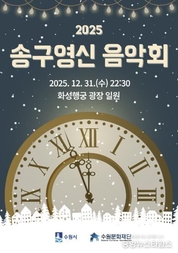 (중앙뉴스타임스 = 이광운 기자) 수원문화재단은 오는 31일 오후 10시 30분부터 수원 화성행궁 광장 일원에서 2025년을 마무리하고 2026년 신년을 맞이하는 ‘2025 송구영신 음악회’를 개최한다. 이번 음악회에는 누구나 쉽게 즐길 수 있는 재즈 공연을 선보이는 5인조 재즈밴드 ‘리치파이’와 전통 타악의 역동적인 매력을 전달하는 ‘소리스’가 무대에 오른다. 또한 JTBC '싱어게인4'에서 ‘19호 가수’로 활약 중인 ‘이상웅’이 참여해 깊이 있는 무대를 선보일 예정이다. 수원문화재단 관계자는 “전통과 현대가 어우러진 다채로운 무대를 통해 시민들과 함께 한 해를 뜻깊게 마무리하고자 한다”며 “온 가족이 함께 따뜻한 새해를 맞이하시길 바란다”고 전했다. 한편, ‘2025 송구영신 음악회’가 펼쳐질 화성행궁 광장 옆 여민각에서는 새해맞이 경축 타종 행사도 진행될 예정이다. 이와 함께 화성행궁 광장에서는 떡국 나눔 행사도 함께 마련된다. 자세한 내용은 수원문화재단 홈페이지를 통해 확인할 수 있다.
