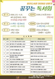 (중앙뉴스타임스 = 이광운 기자) 김포시 풍무도서관은 오는 3월 13일부터 6월 12일까지 매주 금요일 총 12회에 걸쳐 2026년 상반기 ‘꿈꾸는 독서회’를 운영한다고 12일 밝혔다. 이번 독서회에는 총 30명의 초등학생들이 함께할 수 있으며, 어린이 독서회 운영에 경험이 많은 장은아, 오은희 강사가 진행한다. 다양한 도서들을 읽고 독서토론 등 다양한 독후활동을 할 수 있도록 구성했고, 아이들의 문해력 향상에 도움을 줄 것으로 기대된다. 참여 신청은 2월 19일 오전 10시부터 풍무도서관 홈페이지에서 가능하며, 김포시 관내 초등학생 2~3학년 15명, 4~6학년 15명 총 30명을 선착순 모집한다.