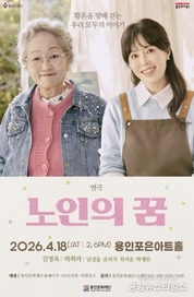 (중앙뉴스타임스 = 이광운 기자) 용인문화재단은 오는 4월 18일 오후 2시와 6시, 용인포은아트홀에서 연극 '노인의 꿈'을 개최한다고 5일 밝혔다. 이번 공연은 LG아트센터 서울에서 진행한 초연의 호평을 바탕으로 전국투어로 이어지는 작품으로, 세대를 아우르는 따뜻한 가족 드라마로 기대를 모은다. '노인의 꿈'은 인기 웹툰을 원작으로 한 작품으로, 연극 인생의 갈림길에 선 인물들의 내면을 따뜻하게 그려낸 작품이다. 작은 미술학원을 운영하는 중년 여성 ‘봄희’는 경영난과 가족 갈등, 갱년기로 인한 불안 속에서 흔들리던 중 “내 영정사진을 직접 그리고 싶다”고 말하는 유쾌한 할머니 ‘춘애’를 만나며 변화를 맞는다. 서로 다른 세대의 두 사람은 그림을 매개로 마음을 나누고, 잊고 지냈던 꿈과 삶의 의미를 되찾아가며 세대 간 이해와 화해, 치유의 메시지를 전한다. 용인 공연에서는 원로배우 김영옥이 솔직하고 사랑스러운 ‘춘애’ 역을 맡아 특유의 따뜻한 카리스마를 선보인다. 하희라는 복합적인 감정 변화를 겪는 ‘봄희’ 역으로 깊이 있는 연기를 펼치며, 남경읍은 봄희의 아버지 ‘상길’ 역으로 출연해 세대 갈등과 가족애를 현실감 있게 그려낸다. 이 외에도 탄탄한 연기력을