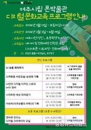 (중앙뉴스타임스 = 이광운 기자) 여주세종문화관광재단 여주시립 폰박물관은 2026년 상반기 디지털 역량 강화를 위한 '디지털문화교육프로그램'수강생을 모집한다고 24일 밝혔다. 이번 교육은 급변하는 디지털 환경 속에서 시민들이 일상에서 활용 가능한 실질적인 디지털 기술을 익히고, 창의적 콘텐츠제작 능력을 기를 수 있도록 기획됐다. AI활용부터 스마트폰 기초, 사진, 디지털 디자인, 캘리그라피까지 폭넓은 주제로 구성해 세대별 맞춤 교육을 제공한다. 교육 운영 기간은 2026년 3월 3일부터 6월 19일 까지이며, 수강신청은 2월 12일부터 선착순으로 접수한다. 여주시민을 대상으로 하며 성인과 초등학교 5-6학년 과정으로 나누어 운영된다. ■ 성인 대상 프로그램 (총 14회 과정) ▶ AI 숏폼 제작하기 AI 기초 이해부터 숏폼 콘텐츠 제작 실습까지 진행한다. (3.10.~6.16. 매주 화 13:00~15:00) ▶ 스마트폰 사진교실 – 손안의 기록 스마트폰을 활용한 촬영 기법과 감성 사진 표현을 배운다. (3.10.~6.16. 매주 화 15:30~17:30) ▶ 나만의 디지털 디자인 스토리 with 캔바 캔바를 활용한 디지털 디자인 제작 교육. (3.11.~6