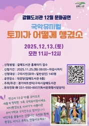 (중앙뉴스타임스 = 이광운 기자) 구리시 갈매도서관은 국악뮤지컬 '토끼가 어떻게 생겼소' 무료 관람 사전 신청을 25일부터 갈매도서관 홈페이지에서 선착순으로 신청받는다고 밝혔다. 국악뮤지컬 '토끼가 어떻게 생겼소'라는 연말을 맞아 오는 12월 13일 오전 11시, 갈매도서관 6층 대강당에서 경기아트센터와 함께 어린이와 가족을 위해 마련된 공연이다. 이번 공연은 지역 주민들의 연말 문화 향유 기회를 확대하고자 기획됐으며, 우리 전통 판소리‘수궁가’를 모티브로 새롭게 창작된 어린이 가족 국악뮤지컬이다. 익숙한 이야기와 흥겨운 음악이 어우러져 생동감 넘치는 무대가 펼쳐질 예정이다. 특히 작품 속에는 바다 생태계를 지키는 내용과 환경의 중요성을 담은 메시지가 포함되어 있어, 관람객들이 공연을 즐기면서 자연보호의 의미를 자연스럽게 배울 수 있는 시간이 될 것으로 기대된다. 백경현 구리시장은 “이번 공연이 아이들과 가족들이 함께 웃고 공감하며 환경의 소중함을 느낄 수 있는 시간이 될 것”이라며 “환경 특화도서관으로 자리 잡은 갈매도서관에서 앞으로도 환경을 생각하고 환경의 가치를 깨닫는 다양한 프로그램이 운영되도록 노력하겠다”라고 말했다.