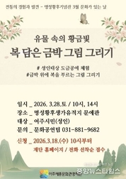 (중앙뉴스타임스 = 이광운 기자) 여주세종문화관광재단은 오는 28일 명성황후기념관 3월 문화가 있는 날 프로그램으로 '유물 속의 황금빛, 복 담은 금박 그림 그리기'를 진행한다고 26일 밝혔다. 명성황후기념관은 여주에서 태어나고 자란 명성황후를 기념하고 관련된 조선시대의 문화를 전시, 연구하는 박물관으로 매달 여주시민을 위한 문화가 있는 날을 진행하고 있다. ‘전통의 경험과 발견’이라는 주제로 진행되는 문화가 있는 날은 일상에서 접하기 어려운 우리의 전통문화를 경험하는 기회로 3월에는 수천년의 시간 에도 화려한 빛을 발하는 우리나라 금박공예를 탐구하는 시간으로 진행된다. 금은 오랜 시간이 지나도 변치 않는 빛과 가치로 풍요와 권위, 영원함을 상징하고 있으며 이러한 금의 가치를 담은 여러 유물이 전해오고 있다. 그중 금을 두드려 종이처럼 얇게 만든 금박을 천, 나무, 종이 등에 씌우는 ‘금박 공예’는 금빛의 아름다움뿐만 아니라, 여러 재료들과 쉽게 결합하여 또다른 가치를 만들 수 있다는 장점으로 인해 지금까지도 많은 사랑과 쓰임을 받고 있다. 명성황후기념관은 우리나라 문화재를 수리하는 전문가를 모시고 이러한 금박공예의 원리를 배우고 국가 유산 속 금박의 역할과