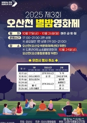 (중앙뉴스타임스 = 이광운 기자) 오산시는 오는 17일부터 26일까지 매주 금·토·일 저녁, 오산천(오색문화체육센터 뒤편)에서 시민들이 야외에서 영화를 즐길 수 있는 '2025 제3회 오산천 별밤영화제'를 개최한다고 14일 밝혔다. 이번 영화제는 남녀노소 누구나 즐길 수 있는 총 10편의 애니메이션과 영화를 상영하며, 오산천을 방문하는 시민이라면 누구나 자유롭게 관람할 수 있다. 특히 올해는 관람객 편의를 위해 ‘배달음식 픽업존’을 운영하여, 휴대폰 앱으로 주문한 음식을 지정된 장소에서 간편하게 수령할 수 있다. 관람객들은 돗자리나 방석 등을 지참해, 자연 속에서 맛있는 음식과 함께 여유로운 영화 관람을 즐길 수 있다. 시 관계자는 “도심 속 자연과 문화가 조화를 이루는 오산천에서 열리는 이번 별밤영화제가 시민들에게 힐링과 특별한 문화 체험의 기회가 되길 바란다”고 전했다.