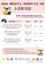 (중앙뉴스타임스 = 이광운 기자) 광명시 게임창작소는 오는 29일 오전 10시부터 겨울방학 프로그램 수강생을 모집한다. 이번 프로그램은 초등학생을 대상으로 한 겨울방학 특별 프로그램으로 생성형 인공지능(AI)을 활용한 가상현실(VR) 게임 만들기 등 학교에서 경험해 보기 어려운 AI 디지털 분야의 다양한 교육과정으로 구성했다. 교육과정은 2026년 1월 12일부터 2월 5일까지 운영하며, ▲‘생각이 자라는 코딩놀이: 언플러그드 코딩’ ▲‘스크래치와 함께하는 겨울 코딩 대모험’ ▲‘생성형 AI와 함께하는 VR 게임 개발’ 등 총 3개 과정으로 진행한다. 김광용 하안도서관장은 “이번 겨울방학 프로그램은 아이들이 창의 교육을 통해 디지털 세상의 원리를 이해하고, 스스로 문제를 해결하는 능력을 기를 수 있는 기회가 될 것”이라며 “미래 교육에 관심 있는 학생과 학부모의 많은 참여를 바란다”고 말했다. 참여를 희망하는 시민은 12월 29일 오전 10시부터 광명도서관 누리집에서 선착순으로 신청할 수 있다.