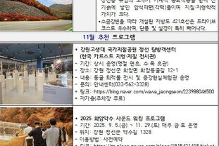 (중앙뉴스타임스 = 방재영 기자) 강원특별자치도와 강원관광재단은 ‘2025-2026 강원 방문의 해’ 10월 추천 여행지로 철원군과 정선군을 선정하여 대대적인 홍보마케팅을 추진한다고 23일 밝혔다. 10월에는 철원의 ‘고석정 꽃밭’과 정선의 ‘민둥산’을 집중적으로 홍보할 예정이다. 철원 ‘고석정 꽃밭’은 과거 군사 훈련지였던 곳을 주민들이 직접 꽃을 심고 가꾸며 시작된 곳으로, 맨드라미, 천일홍, 백일홍 등 다채로운 꽃을 감상할 수 있다. 특히 8월 27일부터 11월 2일까지는 가을 개장 시즌으로 더욱 아름다운 풍경을 만날 수 있다. 그 외에도 유네스코 세계지질공원으로 지정된 한탄강의 주상절리를 따라 걸을 수 있는 잔도길인 ‘철원 한탄강 주상절리길’, 180m 길이의 다리 위에서 주상절리 협곡의 웅장한 풍경을 즐길 수 있는 ‘은하수교’, 철원의 역사와 상징을 느낄 수 있는 ‘횃불전망대’등이 있다. 또한, 한탄강 위를 걸으며 주상절리를 감상할 수 있는 ‘철원한탄강 물윗길’ , 모노레일을 타고 산 위에 올라 철원평야를 한눈에 내려다볼 수 있는‘소이산 모노레일’, 60년간 출입이 통제됐던 디엠지(DMZ)의 원시 생태계를 직접 체험할 수 있는 ‘디엠지(DMZ) 생태