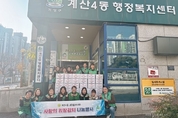 (중앙뉴스타임스 = 방재영 기자) 인천 계양구 계산4동 새마을부녀회(회장 이옥임)는 지난 20일 ‘2025년 사랑의 김장 나눔 행사’를 열고 정성껏 준비한 김치를 지역 내 취약계층과 경로당에 전달했다. 이옥임 부녀회장은 “작은 정성이지만 어려운 이웃들에게 따뜻한 도움이 되길 바란다.”라며 “앞으로도 지속적인 나눔 활동을 이어가겠다.”라고 말했다. 한경화 계산4동장은 “추운 날씨에도 사랑의 김장 나눔 행사에 참여해 주신 많은 분들께 진심으로 감사드리며, 도움의 손길이 필요한 이웃에게 힘이 되기를 바란다.”라고 말했다.