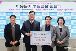 (중앙뉴스타임스 = 방재영 기자) 인천 미추홀구는 5일 구청장실에서 인천옥외광고협회 미추홀구지부(지부장 강성조)로부터 관내 저소득층을 위한 후원금 300만 원을 전달받았다. 이날 전달받은 후원금은 관내 저소득층을 지원하는 데 사용될 예정이다. 강성조 지부장은 “어려운 경기 속에서도 주변의 어려운 이웃과 함께하고자 하는 회원들의 마음을 모아 후원하게 됐다”라며 “도움이 필요한 가구를 위해 잘 사용해 주시길 바란다”라고 전했다. 이영훈 구청장은 “3년째 이어지는 꾸준한 나눔에 깊은 감사를 드리며, 후원금은 꼭 필요한 곳에 소중히 사용하겠다”라고 말했다. 한편, 인천옥외광고협회 미추홀구지부는 3년째 이웃돕기 후원을 이어오고 있으며, 미추홀구와 옥외광고물 재난방재단 협약을 맺고 개학기 학교 주변 불법 광고물 합동 정비, 풍수해 대비 옥외광고물 안전 점검 등 지역사회 발전에 이바지하고 있다.
