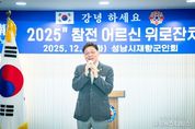 (중앙뉴스타임스 = 방재영 기자) 성남시의회는 2일 중원구 산성대로 소재 루미에르 애비뉴에서 열린 재향군인회‘2025년 참전어르신 위로잔치’에 참석했다. 이번 행사는 국가를 위해 헌신한 참전유공자들의 공헌을 예우하고 감사의 마음을 전하기 위해 마련됐다. 이날 행사에서는 참전어르신들을 위한 식사 대접과 함께 위로 공연, 소통의 시간이 이어지며 훈훈한 분위기가 펼쳐졌다. 참석자들은 참전유공자들의 노고에 깊은 감사의 뜻을 전하며 건강과 안녕을 기원했다. 안광림 부의장은“대한민국의 자유와 평화는 참전용사분들의 헌신 속에서 지켜졌다”며“성남시의회도 어르신들의 명예와 복지가 더욱 두터워질 수 있도록 지속적으로 관심을 기울이겠다”고 말했다.