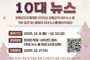 (중앙뉴스타임스 = 방재영 기자) 양평군은 ‘2025년 양평군 올해의 10대 뉴스’ 선정을 위한 온라인 투표를 오는 8일부터 12일까지 실시한다고 5일 밝혔다. 이번 투표는 올 한 해 군민들로부터 가장 공감을 받은 주요 뉴스를 선정하고, 군민들의 목소리를 내년도 정책 수립과 시책 추진에 반영하기 위해 마련됐다. 온라인 투표는 카카오톡 양평군 채널 ‘양평톡톡’, 문자메시지, 사회관계망서비스(SNS) 등을 통해 안내되는 접속 주소 또는 정보무늬(QR코드)를 통해 참여할 수 있다. 1인당 최대 10건의 뉴스를 선택할 수 있으며, 대상은 올해 배포된 34건의 주요 뉴스다. 전진선 양평군수는 “2025년 ‘매력양평’을 향해 추진해 온 주요 정책과 성과를 군민 여러분께서 직접 선정해 주시는 과정이, 군정 전반에 대한 공감과 소통의 기회를 더욱 넓히는 뜻깊은 계기가 되길 바란다”며 “군민의 참여가 곧 양평 발전의 동력인 만큼, 앞으로도 군정에 많은 관심과 적극적인 참여를 부탁드린다”고 말했다. 한편, 군은 오는 17일 투표 참여자 중 100명을 추첨해 음료 기프티콘을 지급할 예정이다.
