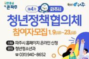 (중앙뉴스타임스 = 방재영 기자) 파주시는 청년이 정책의 수혜자를 넘어 직접 참여하는 정책 주체로 성장할 수 있도록, ‘제4기 파주시 청년정책협의체’참여자를 오는 23일까지 모집한다. 제4기 청년정책협의체는 정책 활동 중심의 내실 있는 운영을 목표로 분과를 세분화해 분야별 정책 발굴과 제안 기능을 강화할 계획이다. 운영 분과는 일자리, 주거·복지, 문화·교육, 참여·기반 등으로 구성되며, 분과별 자율 회의를 통해 정책 제안 활동을 추진하게 된다. 모집 인원은 총 40명 이내로, 파주시에 주민등록을 두고 있거나 파주시 소재 학교·직장·단체 등에서 활동 중인 19세 이상 39세 이하 청년이라면 신청할 수 있다. 위촉 기간은 위촉일로부터 2년이며, 활동 실적에 따라 1회에 한해 연임이 가능하다. 선정된 협의체 구성원에게는 파주시장 명의의 위촉장이 수여되며, 회의 참석 시 소정의 활동 수당이 지급된다. 또한 분과별로 우수한 활동을 펼친 참여자에게는 시장 표창이 수여될 예정이다. 참여를 원하는 시민은 파주시청 누리집을 통해 신청할 수 있으며, 지원 신청서와 개인정보 수집·이용 동의서 등 필수 서류를 제출해야