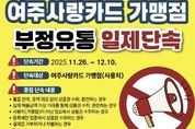 (중앙뉴스타임스 = 방재영 기자) 여주시는 지역화폐인 여주사랑카드의 부정유통 근절을 위해 오는 12월 10일까지 집중 단속에 나선다고 27일 밝혔다. 주요 단속 대상은 ▲ 물품의 판매 또는 용역의 제공 없이 지역화폐를 수취·환전하는 행위 ▲ 실제 매출금액 이상의 거래를 통하여 지역화폐를 수취·환전하는 행위 ▲ 가맹점이 등록 제한업종을 영위하는 경우 ▲결제를 거부하거나 다른 결제 수단에 비해 불리하게 대우하는 행위 ▲기타 단속이 필요성이 있다고 인정되는 경우 등이다. 이번 일제 단속은 가맹점 데이터 목록을 참고 및 주민 신고 등을 토대로 의심되는 현장을 방문해 확인하는 방식으로 진행된다. 여주시 일자리경제과 관계자는 “지역화폐 제도의 지속가능성, 신뢰성을 확보하고 지역 자금의 역외유출 방지를 위해서는 여주사랑카드 사용자와 가맹점주 모두 함께 힘을 합쳐야 건전한 유통 문화를 만들어갈 수 있다”협조를 당부했다. 부정유통 적발 시 여주사랑카드 가맹점 등록취소, 관계 법령에 따라 최대 2,000만원 이하의 과태료가 부과될 수 있으며, 위반행위 조사를 거부·방해 또는 기피하는 경우에도 최대 500만원 이하의 과태료가 부과될 수 있다.