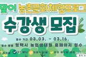 (중앙뉴스타임스 = 방재영 기자) 평택시는 오는 4월부터 농업기술센터에서 도시민의 정서적 안정과 농촌 문화 가치 확산을 위한 '2026년 봄맞이 농촌문화체험 프로그램’을 운영한다. 이번 프로그램은 자연 재료를 활용해 도시민들이 일상 속 스트레스를 해소하고 농업·농촌을 친숙하게 느낄 수 있도록 기획됐으며, 3일부터 16일까지 교육생을 모집한다. 교육 과정은 실습 중심의 4개 강좌로 구성되어 시민들에게 다채로운 즐거움을 선사할 예정이다. 주요 내용은 △평택 특산물을 활용한 로스팅 및 홈카페 메뉴 만들기 △버려지는 자원을 재활용하는 리사이클링 양말목 공예 △천연 아로마 에센스로 화장품을 직접 만드는 힐링 아로마 클래스 △나무에 온기를 담아내는 현대 우드버닝 등 자연 친화적인 취미 활동으로 꾸며진다. 특히 이번 교육은 어렵게 느껴졌던 ‘탄소중립’이나 ‘지역 상생’이라는 가치를 평택 특산물로 맛있는 메뉴를 만들고 예쁜 소품을 빚어보는 활동에 녹여내, 시민들이 일상에서 즐겁고 친근하게 경험할 수 있도록 구성했다. 평택시 농업기술센터 관계자는 “이번 봄맞이 프로그램이 시민들에게는 배움의 즐거움과 휴식을, 농촌에