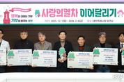 (중앙뉴스타임스 = 방재영 기자) 용인특례시는 19일 지역 내 기업·단체가 ‘사랑의 열차 이어달리기’에 동참하며 나눔 문화가 확산하고 있다고 밝혔다. 로지시스템(주) 등 6개 기업·기관·단체 관계자들은 이날 시청 시장실에서 열린 ‘사랑의 열차 이어달리기’ 전달식에서 성금과 물품을 전달했다. 이날 전달식에서는 ▲로지시스템(주)(성금 2,000만원) ▲용인도시공사(성금 1,400만원) ▲동백정형외과(성금 500만원) ▲(주)지큐에너지(성금 500만원) ▲(주)애플트리(성금 300만원)▲원삼친환경쌀작목회(560만원상당 친환경 백미 10kg 100포)가 사랑의 열차에 동참했다. 이상일 시장은 “경기가 어려워지면서 모금액이 줄어드는 추세인데, 용인은 온정의 손길이 1등이라고 표현할 수 있을 정도로 매년 목표치를 초과 달성하고 있다”며 “지난해도 목표한 금액을 초과 달성했고, 올해도 1월 둘째 주까지 94.7%를 넘어 목표치를 초과할 달성할 수 있을 것으로 생각한다”고 했다. 이 시장은 “삼성전자와 SK하이닉스가 1000조원을 투자하는 초대형 반도체 프로젝트가 진행 중인데, 2029년부터는 세수도 대폭 늘어날 것으로 예상한다”며 “시의 재정이 좋아지는 만큼 지역사회 취