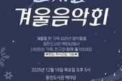(중앙뉴스타임스 = 이광운 기자) 용인특례시 동천도서관은 오는 18일 오후 5시부터 6시까지 동천도서관 지하 1층 책마당(열람형 계단공간)에서 ‘도시숲 겨울 음악회’를 연다고 10일 밝혔다. 이번 음악회는 겨울 분위기에 맞춰 도서관의 색다른 공간에서 모든 세대가 함께 즐길 수 있도록 클래식, 재즈, 영화 오리지널사운드트랙(OST), 캐롤 등이 연주된다. 동천도서관 홈페이지에서 좌석 신청을 받고 있으며, 18일 현장 참여도 가능하다. 도서관 관계자는 해당 프로그램이 “시민에게 도서관 공간을 활용한 문화 행사를 제공할 좋은 기회”라며 “앞으로도 시민의 목소리에 귀 기울이며, 새롭고 다양한 문화 행사를 제공하는 데 힘쓰겠다”고 말했다.