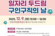 (중앙뉴스타임스 = 방재영 기자) 수원특례시는 12월 9일 오후 3시부터 4시까지 수원시여성문화공간 휴(권선구 동수원로 224번길 10)에서 ‘12월 일자리 두드림 구인·구직의 날’ 채용 행사를 연다. 주식회사 그린씨앤씨텍, 케이티텔레캅주식회사, 주식회사티에프이, 휴먼스토리에프에스㈜, 이트너스㈜ 등 5개 업체가 참여해 전기·전자 부품·제품 조립원, 일반제품 영업원, 기계·무인 경비원, 단체급식 보조원, 일반 택배원 등을 채용한다. 채용 인원은 총 18명이다. 현장에서 구인 기업과 구직자가 1대1 채용 면접을 한다. 수원시는 취업 정보를 제공하고, 이력서·면접 클리닉을 운영하는 등 구직자들을 지원한다. 일자리를 구하는 수원시민은 누구나 참여할 수 있다. 수원일자리센터가 주관하는 ‘일자리 두드림’은 취업에 어려움을 겪는 구직자와 인재 채용을 원하는 기업을 연결해 주는 소규모 채용 행사다. 수원일자리센터는 일자리 두드림 외에도 ‘상설면접’, ‘동행면접’ 등 소규모 채용 행사로 현장 면접과 채용 상담을 동시에 진행하고 있다. 구직자의 부담을 줄이고, 기업이 적합한 인재를 신속하게 채용할 수 있도록 돕고