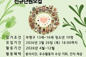 (중앙뉴스타임스 = 방재영 기자) 인천 부평구청소년꿈나래터는 오는 26일까지 2026년도 청소년자원봉사단 ‘청천히 다같이’ 단원을 신규 모집한다고 23일 밝혔다. 청소년자원봉사단은 부평구에 거주하거나 재학 중인 13~16세 청소년을 대상으로 운영되는 자치조직이다. 봉사단은 지역 사회 내 다양한 봉사활동을 직접 기획․운영하게 된다. 이번 모집을 통해 선발된 단원들은 4월부터 12월까지 활동하며 ▲봉사시간 인정 ▲우수활동자 수상 기회 등의 혜택을 받는다. 또한 ▲지역행사 부스 운영 ▲봉사활동 기획 및 운영 등 다양한 활동에 참여할 수 있다. 배재석 부평구청소년꿈나래터 센터장은 “청소년들이 주체적인 자원봉사활동을 통해 지역사회에 대한 관심을 높이고 함께 성장하는 계기가 되길 바란다”고 말했다. 청소년자원봉사단 모집 관련 사항은 전화로 문의하거나, 부평구청소년꿈나래터 누리집 및 카카오톡 채널에서 확인할 수 있다.