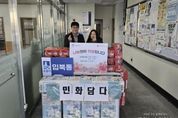 (중앙뉴스타임스 = 방재영 기자) 수원시 권선구 당수동 소재 ‘민화담다’는 지난 26일 입북동 행정복지센터를 방문해 라면 20박스, 휴지 10개를 전달했다. 이번에 기탁한 물품은 ‘민화담다’ 직원들이 어려운 이웃을 생각하며 기부금을 모아 마련했으며, 입북동 지역사회보장협의체를 통해 복지사각지대, 장애인, 한부모가정, 독거어르신 등에 전달될 예정이다. 이경영 입북동장은 “아름다운 나눔으로 우리 사회가 좀 더 따뜻해지고 있다.”며 “기탁해 주신 물품은 어려운 이웃들을 위해 잘 전달하겠다.”라고 말했다. 한편 입북동행정복지센터는 복지사각지대를 발굴하여 긴급 지원 및 사례관리 대상자 연계 등 지역사회에 소외된 이웃에 대한 관심으로 다양한 활동을 펼쳐 나가고 있다.