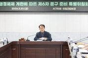 (중앙뉴스타임스 = 방재영 기자) 인천 서구의회 '행정체제 개편에 따른 분구 준비 특별위원회'(위원장 심우창 의원)는 20일 제6차 회의를 열어 분구추진 업무 전반에 대한 추진경과를 보고받고 현안 사항 등을 집중 점검했다. 분구특위는 주요 추진 사항으로 ▲검단구 조직구성안, ▲검단구 본예산 편성, ▲검단구 임시청사 및 인프라 구축 추진상황, ▲각 분야별 사업 추진상황 등을 집중적으로 논의했다. 한편, 검단구 임시청사는 2026년 7월 개청 예정으로, 당하동 1325 외 2필지 일원에 위치하고 연면적은 약 2만㎡ 내외로, 지상 1~3층 규모의 모듈러(Modular) 임차 방식으로 설치될 예정이다. 분구특위는 주요 추진 상황을 보고받고 질의응답을 이어가며 다각도로 분구 추진 과정을 점검했다. 심우창 분구특위 위원장은 “검단구 분구 추진이 잘 마무리될 수 있도록 최선을 다해 주시길 당부드린다”고 밝혔다.