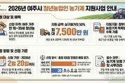 (중앙뉴스타임스 = 방재영 기자) 여주시는 청년농업인의 안정적인 영농 정착과 경영 기반 강화를 위해 '2026년 청년농업인 농기계 지원사업'을 추진한다고 22일 밝혔다. 이번 사업은 관내 청년농업인이 영농에 필요한 농기계를 구입할 경우 구입비의 일부를 지원하는 사업으로, 실구매가의 50% 이내에서 최대 7,500만 원까지 지원된다. 사업비는 총 10억 원(시비 50%, 자부담 50%) 규모다. 지원 대상은 여주시에 주민등록이 되어 있고 실제 관내 농지를 경작하는 만 18세 이상 39세 이하 청년농업인으로, 농업경영체 등록을 완료한 농업인이다. 다만 최근 5년 이내 동일·유사 농기계 지원사업 수혜자, 최근 3년 이내 동 사업 포기자, 농업경영체 미등록자 등은 제외된다. 신청은 2026년 2월 20일까지 주소지 읍·면·동 행정복지센터를 통해 접수하며, 신청서, 사업계획서, 견적서, 농업경영체 등록 확인서 등을 제출하면 된다.