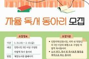 (중앙뉴스타임스 = 방재영 기자) 인천시교육청계양도서관은 지역 내 독서 문화를 확산하고 시민의 자발적인 독서 활동을 지원하기 위해 ‘2026년 자율 독서동아리’를 모집한다고 16일 밝혔다. 인천 시민 또는 지역 내 직장인 5인 이상으로 구성된 독서모임이면 신청할 수 있으며, 선정된 동아리에는 활동 공간과 도서를 제공하고 동아리 활동과 연계된 강좌를 지원한다. 모집 기간은 1월 21일부터 2월 13일까지이며 자세한 사항은 계양도서관 누리집 공지사항을 참고하거나 독서문화과로 문의하면 된다. 계양도서관 관계자는“시민들이 함께 읽고 소통하며 일상 속에서 책 읽는 즐거움을 공유하길 바란다”며 “지역 내 독서 공동체가 활발하게 움직여 책 읽는 지역사회 분위기가 더욱 확산되기를 기대한다”고 말했다.