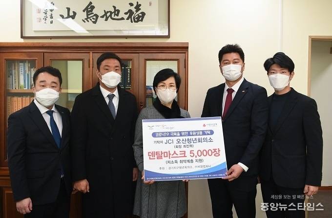 (중앙뉴스타임스 = 방재영 기자) 경기 오산시는 31일 JCI 오산청년회의소(회장 최진혁)가 시청을 찾아 관내 취약계층 코로나19 극복에 사용해 달라며 덴탈마스크 5000매를 기탁했다.