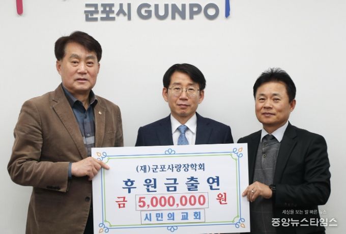 (중앙뉴스타임스 = 방재영 기자) 군포시 궁내동 소재 시민의 교회에서 장학금 500만원을 (재)군포사랑장학회에 미래의 주역인 청소년들을 위해 써달라며 기탁했다.