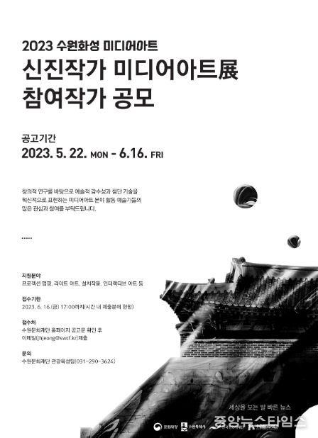 (중앙뉴스타임스 = 방재영 기자) 수원문화재단은 22일부터 내달 16일까지 ‘2023 수원화성 미디어아트 – 신진작가 미디어아트전’에 참여할 작가를 공모한다.