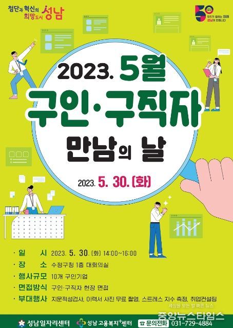 (중앙뉴스타임스 = 이광운 기자) 성남시는 오는 5월 30일 오후 2시~4시 수정구청 1층 대회의실에서 ‘5월 구인·구직자 만남의 날’ 행사를 연다.