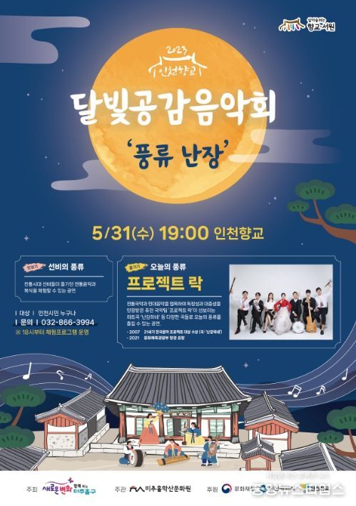 (중앙뉴스타임스 = 방재영 기자) 인천시 미추홀학산문화원은 31일 19시 인천향교 명륜당 마당 야외무대에서 문화재와 자연이 어우러져 고즈넉함을 선사하는 달빛공감음악회 ‘풍류 난장’을 개최한다.