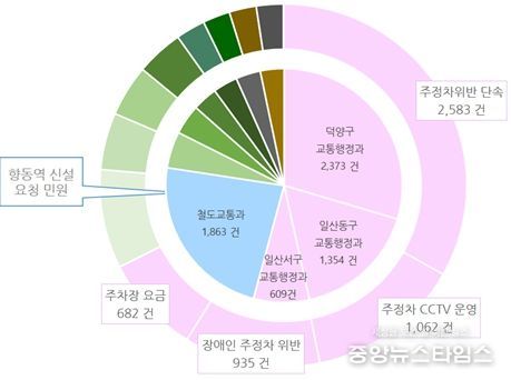 국민신문고를 통해 고양시에 접수된 민원은 주정차 위반 관련 민원이 가장 많았고, 향동역 신설 요청 민원 역시 빈번하게 들어왔다. 지역별로는 덕양구 향동지구와 덕은지구에 관한 민원이 많았고, 주차문제, 교통시설, 주거환경에 관한 내용이 주를 이루었다.